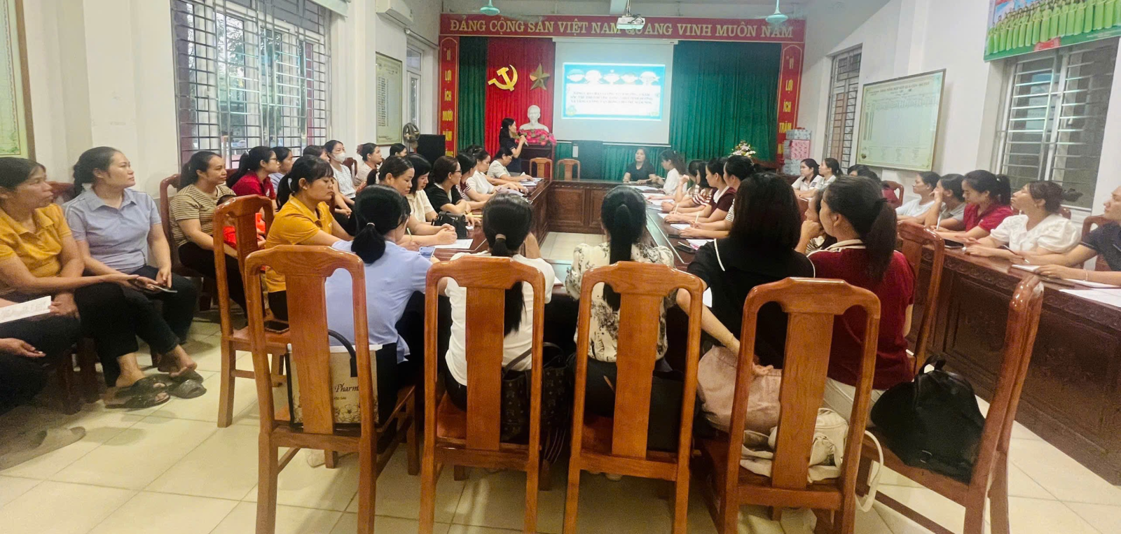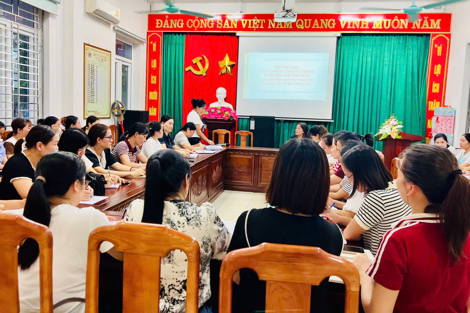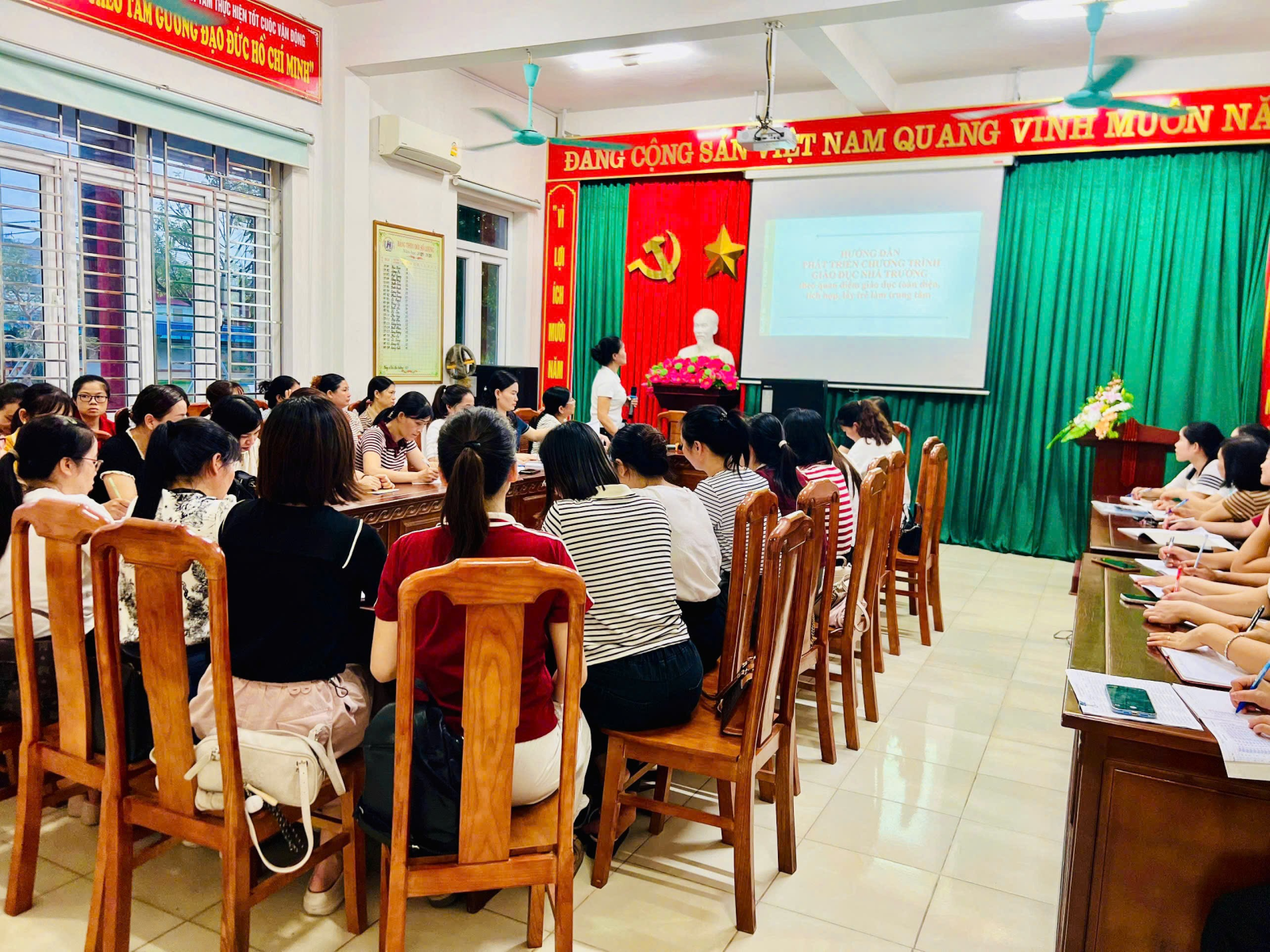 Thực hiện nhiệm vụ năm học 2025 – 2026 và kế hoạch bồi dưỡng chuyên môn cho đội ngũ, sáng ngày 04 tháng 10 năm 2025, Trường Mầm non Xuân Tiến đã tổ chức buổi tập huấn: “Phát triển chương trình GD nhà trường theo quan điểm toàn diện, tích hợp, lấy trẻ làm trung tâm’’ “Hướng dẫn SHCM phù hợp với điều kiện thực tế của trường mầm non và sinh hoạt chuyên môn theo nghiên cứu bài học” “Nâng cao chất lượng nuôi dưỡng, chăm sóc trẻ theo hướng lồng ghép dinh dưỡng và tăng cường vận động cho trẻ mầm non”Đây là hoạt động có ý nghĩa quan trọng nhằm nâng cao chất lượng chăm sóc – giáo dục trẻ, đáp ứng yêu cầu đổi mới căn bản, toàn diện giáo dục trong giai đoạn hiện nay.